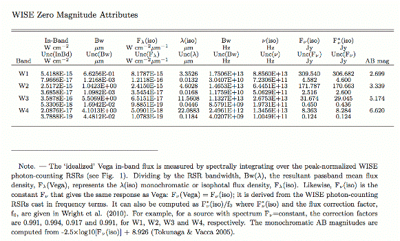 the zero magnitude flux density, derived using a constant power-law spectra, is appropriate and may be used to convert WISE magnitudes to flux density [Jy] units. Table 1 lists the zero magnitude flux density (column 2)